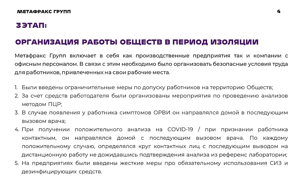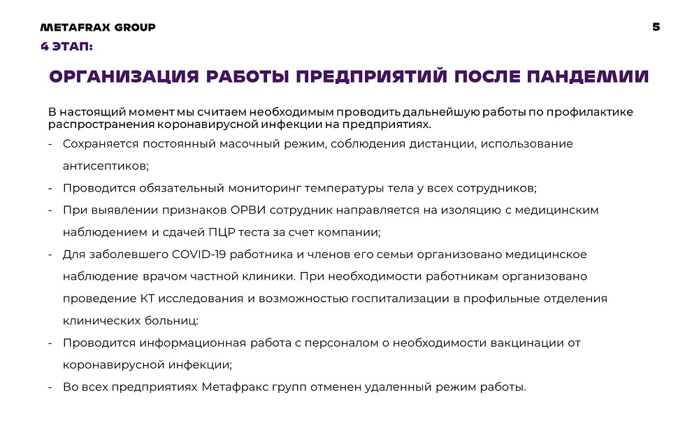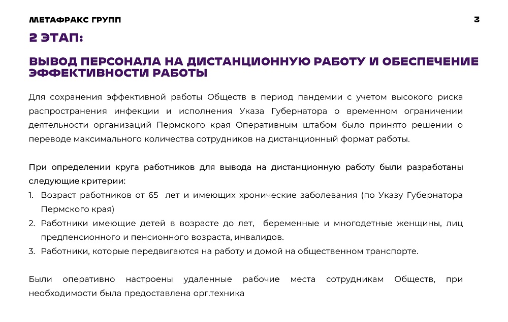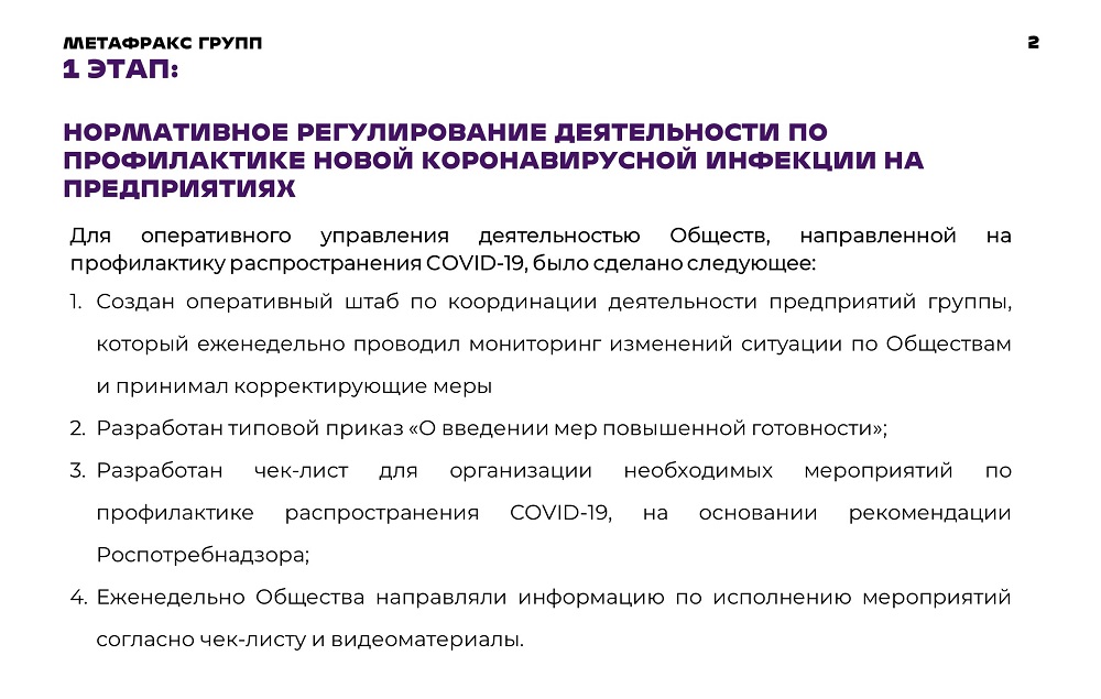 Холдинг «Метафракс» создал собственный оперативный штаб, который еженедельно проводил мониторинг по компаниям группы и принимал корректирующие меры. Кроме того, компания вывела на дистанционную работу значительную часть сотрудников — не только людей старше 65 лет и с хроническими заболеваниями, но и работников с маленькими детьми и тех, кто добирается до работы на общественном транспорте. Большинство совещаний в компании до сих пор проводятся онлайн. «Многие организационные процессы мы тоже смогли перевести в режим дистанта, хотя когда-то нам это казалось невозможным. Это привело к сокращению затрат на командировки, повышению эффективности расходования рабочего времени и в целом положительно влияет на баланс работы и жизни наших сотрудников», — сказал начальник отдела по персоналу ООО «Метафракс Трейдинг» Иван Феоктистов.