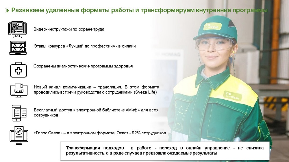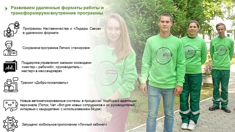 Как рассказал директор филиала Денис Мальцев, основной упор был сделан на обучение руководителей компании тому, как трансформировать рабочую среду под новую реальность и контролировать соблюдение на предприятии профилактических мер. Также компания перевела в онлайн-режим все управленческие встречи, инструктажи, корпоративные конкурсы, подбор и обучение новых сотрудников. «Кроме того, мы продолжали реализацию наших крупных инвестпроектов — расширение производства фанеры и строительство крупного энергоцентра. Управление пуско-наладочными работами в рамках этих проектов пришлось перевести в онлайн», — сообщил господин Мальцев.