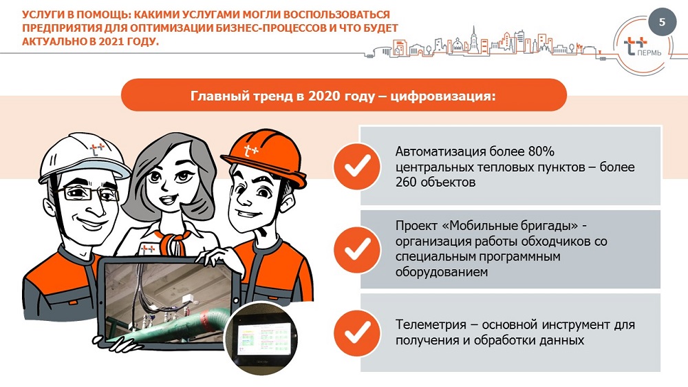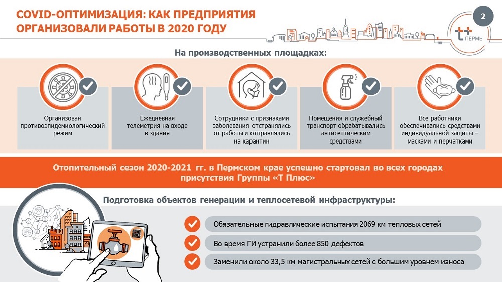 Пермский филиал ПАО «Т Плюс» мобилизовал работу с первых дней ограничений. Как пояснил заместитель директора филиала по коммерции и развитию Алексей Мартьянов, из-за необходимости непрерывно обеспечивать город теплом и начинать подготовку к новому отопительному сезону у компании не было времени на долгую переналадку всех процессов. «Мы приостанавливали работу только на три ремонтных дня. За это время вывели на „удаленку“ весь управляющий персонал, работники станций ограничили свои перемещения. В некоторых регионах пришлось организовывать работу на станциях вахтовым методом, но в Пермском крае не возникло необходимости в таких жестких мерах. Через неделю в особом режиме возобновились и все ремонтные работы, в итоге нам удалось реализовать запланированную на 2020 год инвестпрограмму на 100%», — подчеркнул господин Мартьянов.