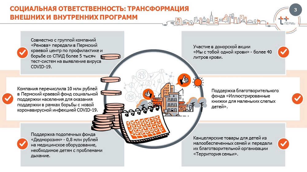 Благотворительные программы ПАО «Т Плюс» также сосредоточились на борьбе с коронавирусной инфекцией. Совместно с компанией «Ренова» холдинг передал в Пермский краевой центр по борьбе со СПИД более 5 тыс. тест-систем на выявление COVID-19, 10 млн руб. компания перечислила в региональный фонд поддержки населения в рамках борьбы с инфекцией, 800 тыс. руб. было направлено в фонд «Дедморозим» на медицинское оборудование, необходимое детям с проблемами дыхания.