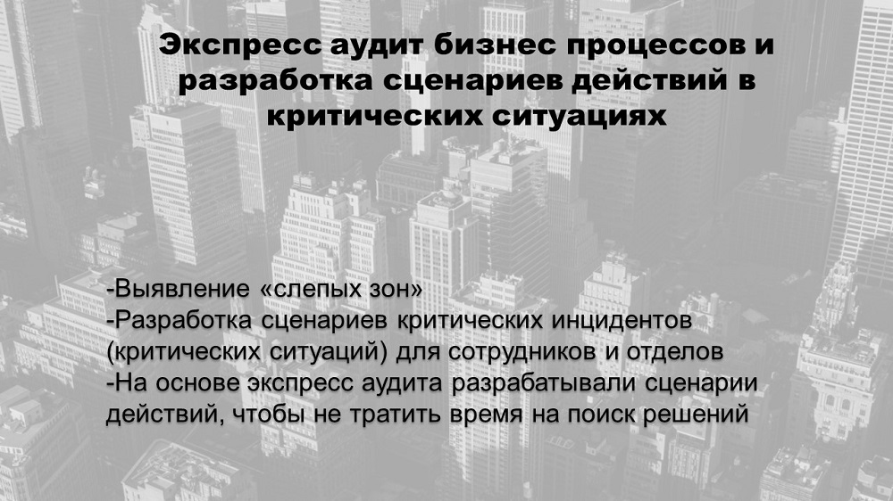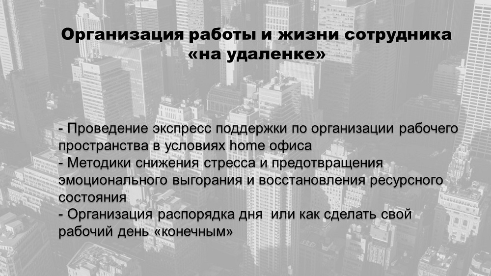 У предприятий также была возможность получить внешнюю поддержку. ГК «Каменный город», оказывающая образовательно-консультационные услуги бизнесу, разработала ряд своих методик по организации работы во время пандемийных ограничений и начала делиться ими с другими компаниями. Как сообщила гендиректор «Каменного города», ректор Западно-Уральского института экономики и права Наталия Агафонова, ГК начала консультировать предпринимателей по трем основным направлениям: юридическим тонкостям режима самоизоляции, организации работы на «удаленке» и обеспечению информационной безопасности, получению финансовой поддержки от государства (сбор необходимых документов, ведение переговоров и прочее). Также ГК проводила аудит компаний и предлагала экспресс-сценарии для сохранения их эффективности.
