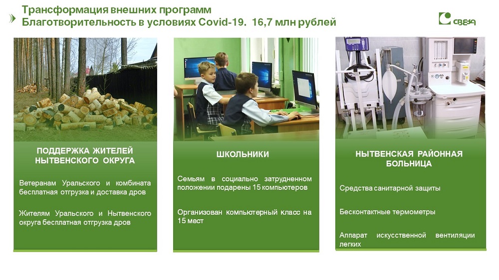Существенно изменились в пандемию направления внешней деятельности компаний. Филиал «Уральский» ООО «Свеза лес» обеспечил бесплатную отгрузку дров жителям Нытвенского района, оборудовал компьютерный класс в школе в поселке Уральском, обеспечил компьютерами детей из 15 семей, находящихся в социально затрудненном положении, закупил СИЗы, бесконтактные термометры и аппарат ИВЛ для нытвенской больницы. «Мы понимали, что многие группы населения попали в очень непростые условие, и переформатировали нашу программу таким образом, чтобы она стала более адресной», — отметил директор филиала Денис Мальцев.