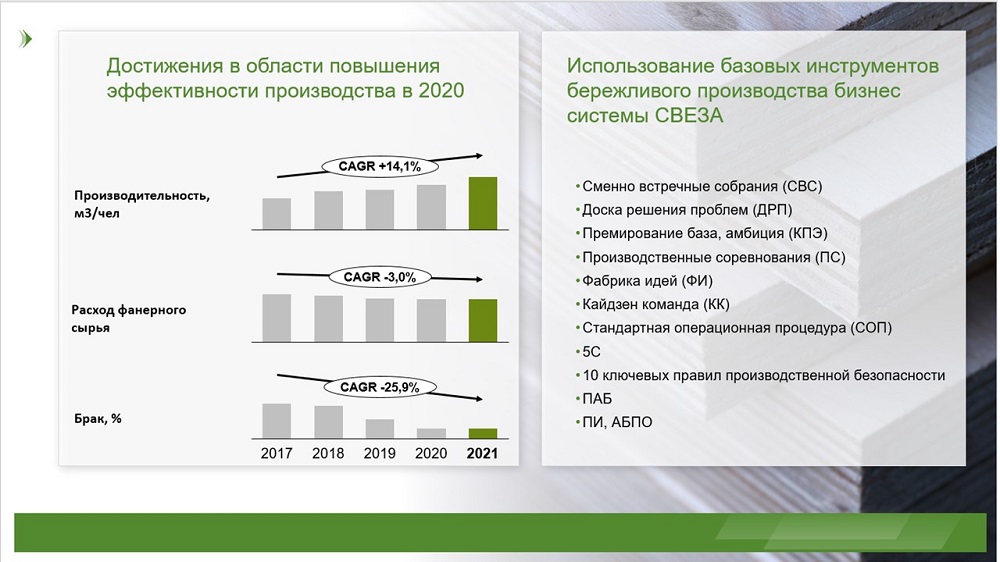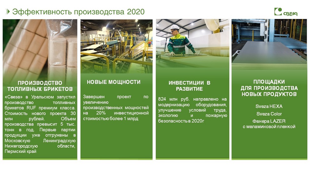 Несмотря на нестандартные условия, предприятия стремились продолжить наращивать производительность труда. Филиал «Уральский» компании «Свеза лес» в 2020 году увеличил этот показатель на 14,1% (м3/человека в год). Среднегодовое снижение расхода сырья и снижение брака за тот же период составило 3% и 25, 9 соответственно. Достигнутые темпы были сохранены и в 2020 году. Также филиал реализовал ряд крупных проектов, направленных на рост производительности. В частности, был завершен проект по увеличению мощностей предприятия на 20%, вложения составили более 1 млрд руб. Еще 824 млн руб. было инвестировано в модернизацию оборудования, улучшение условий труда, экологию и пожарную безопасность. Помимо этого «Уральский» начал производство топливных брикетов, сейчас готовятся к вводу в эксплуатацию производственные площадки, на которых будут изготавливаться еще четыре новых продукта.