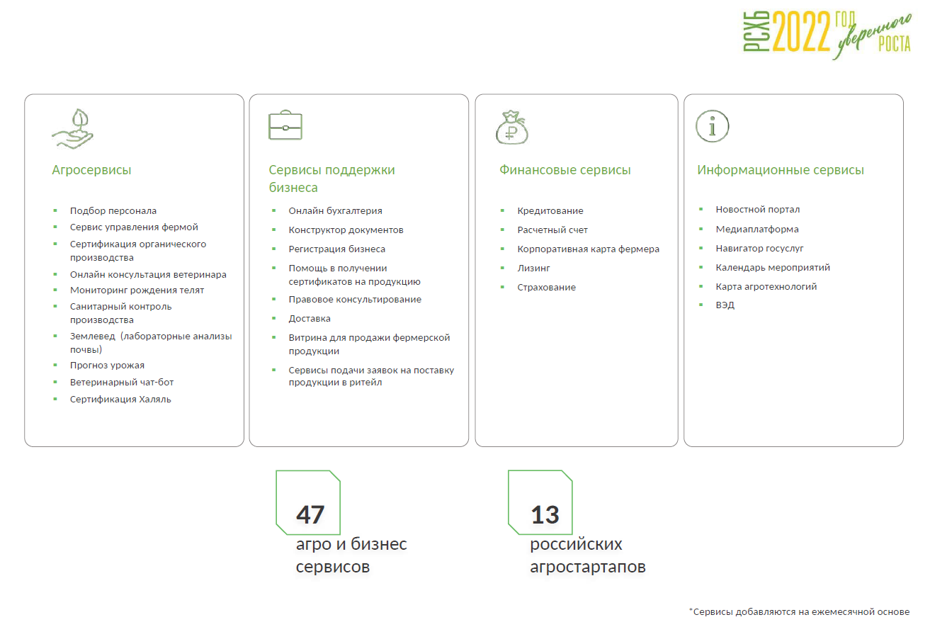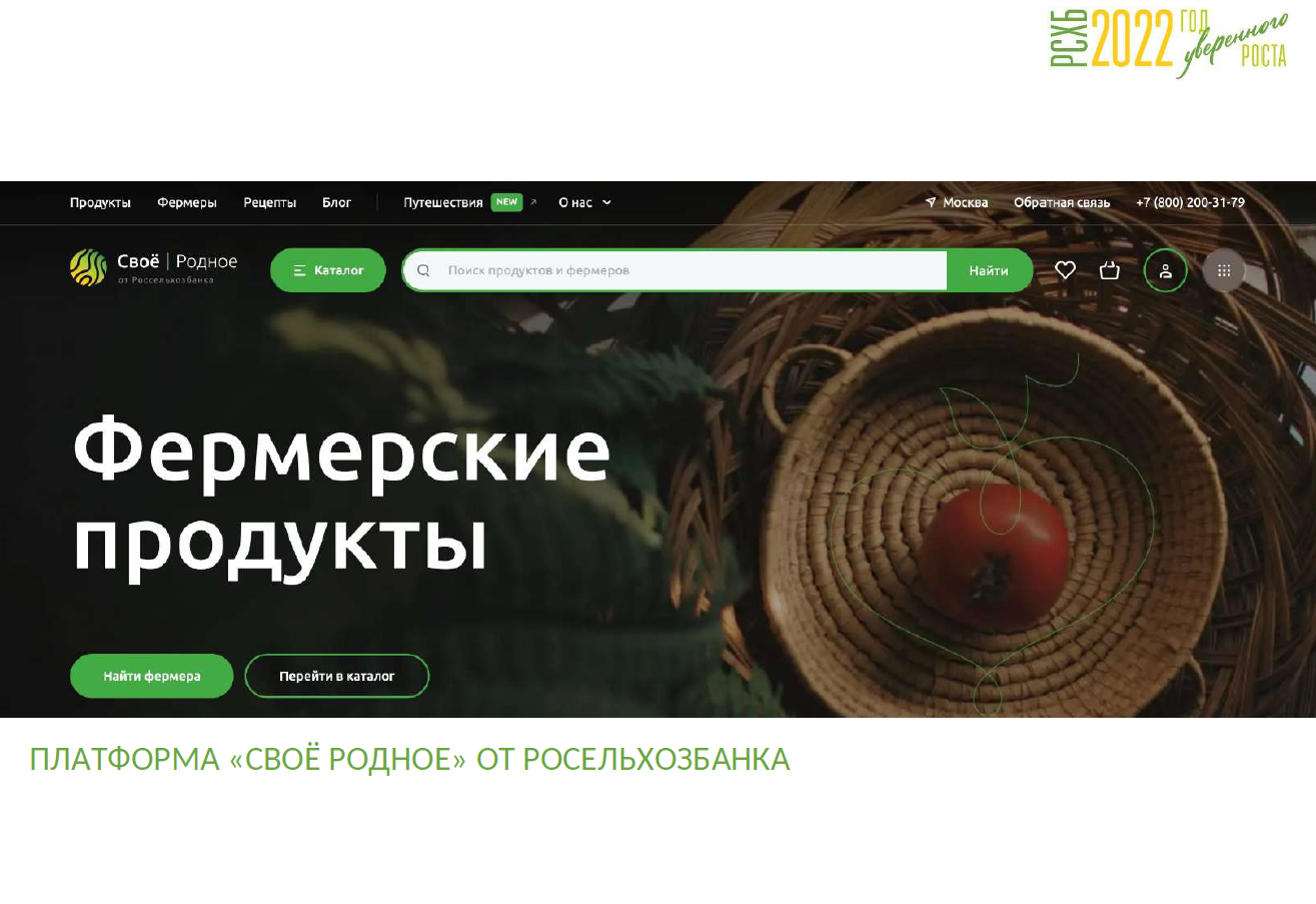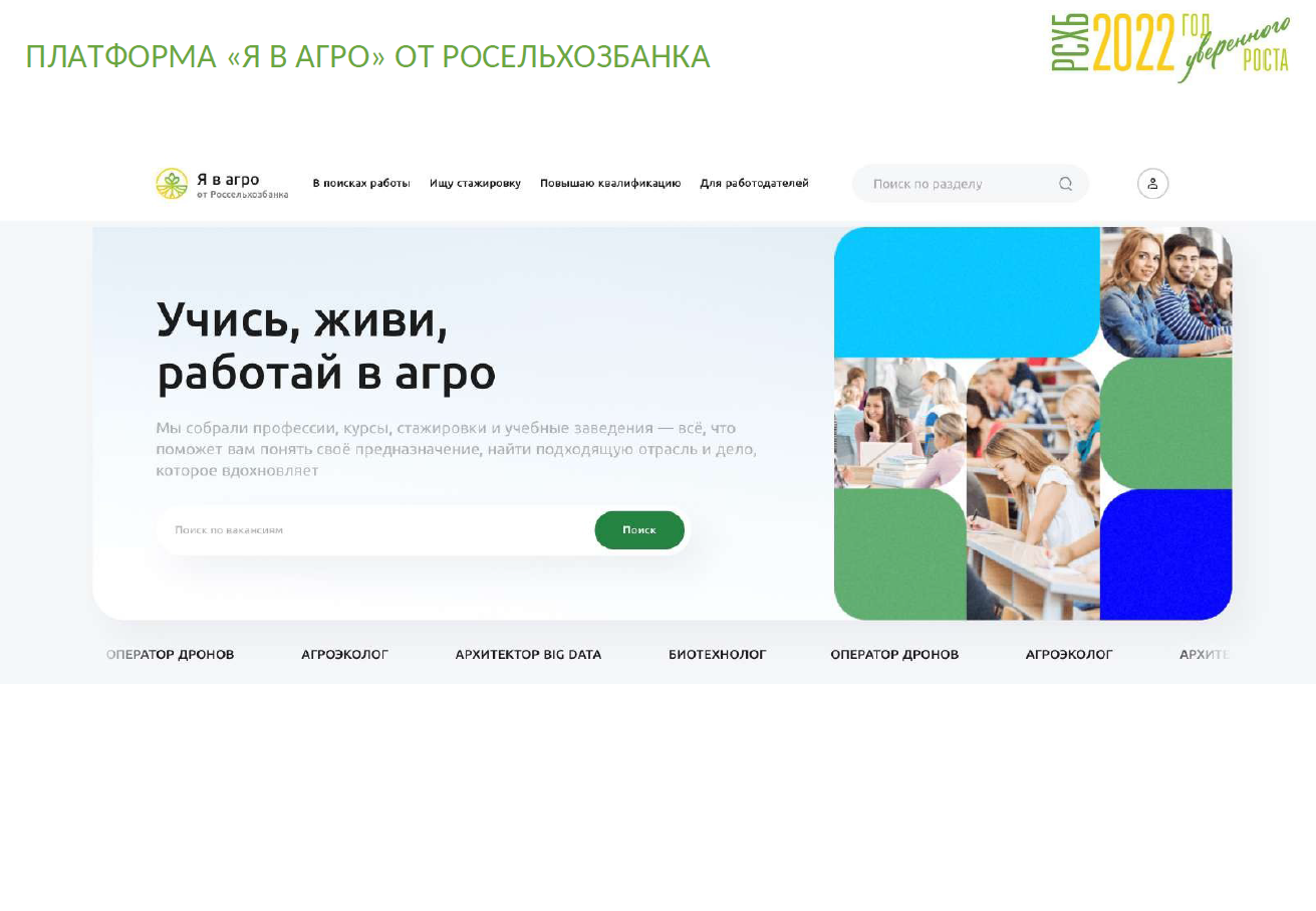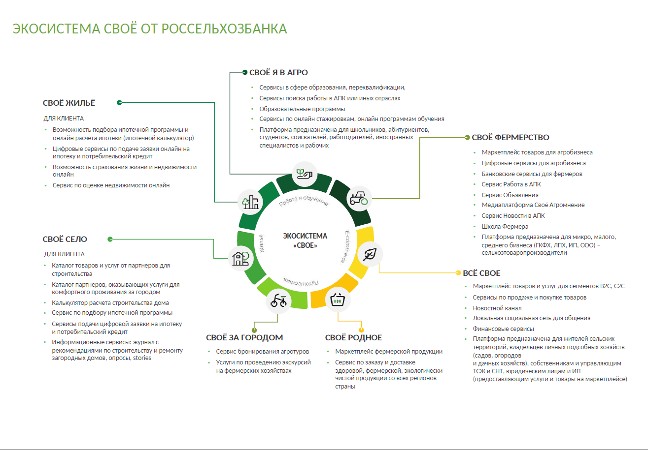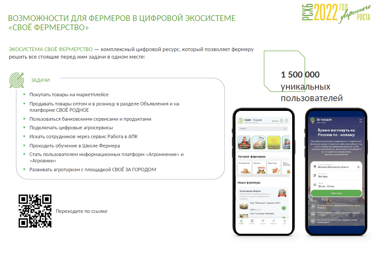 Россельхозбанк разрабатывает целую экосистему цифровых решений для сельхозбизнеса. Она объединяет несколько платформ, на базе которых можно пройти обучающие курсы и стажировки, найти работу в сфере агропромышленного комплекса, подобрать ипотечную программу, чтобы выгодно приобрести жилье в сельской местности, продать и купить фермерскую продукцию на маркетплейсах, забронировать агротуры и многое другое.