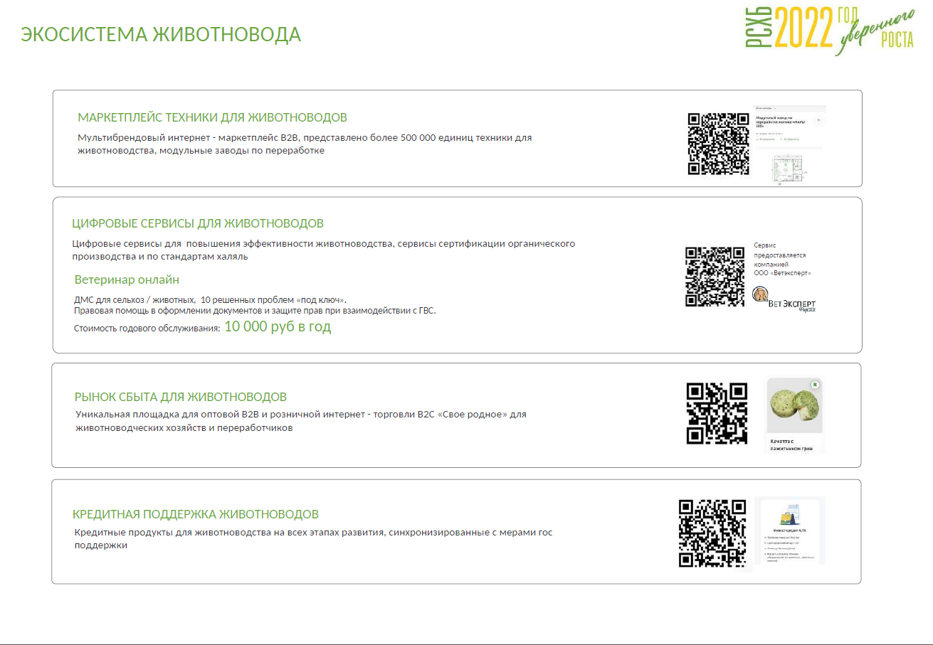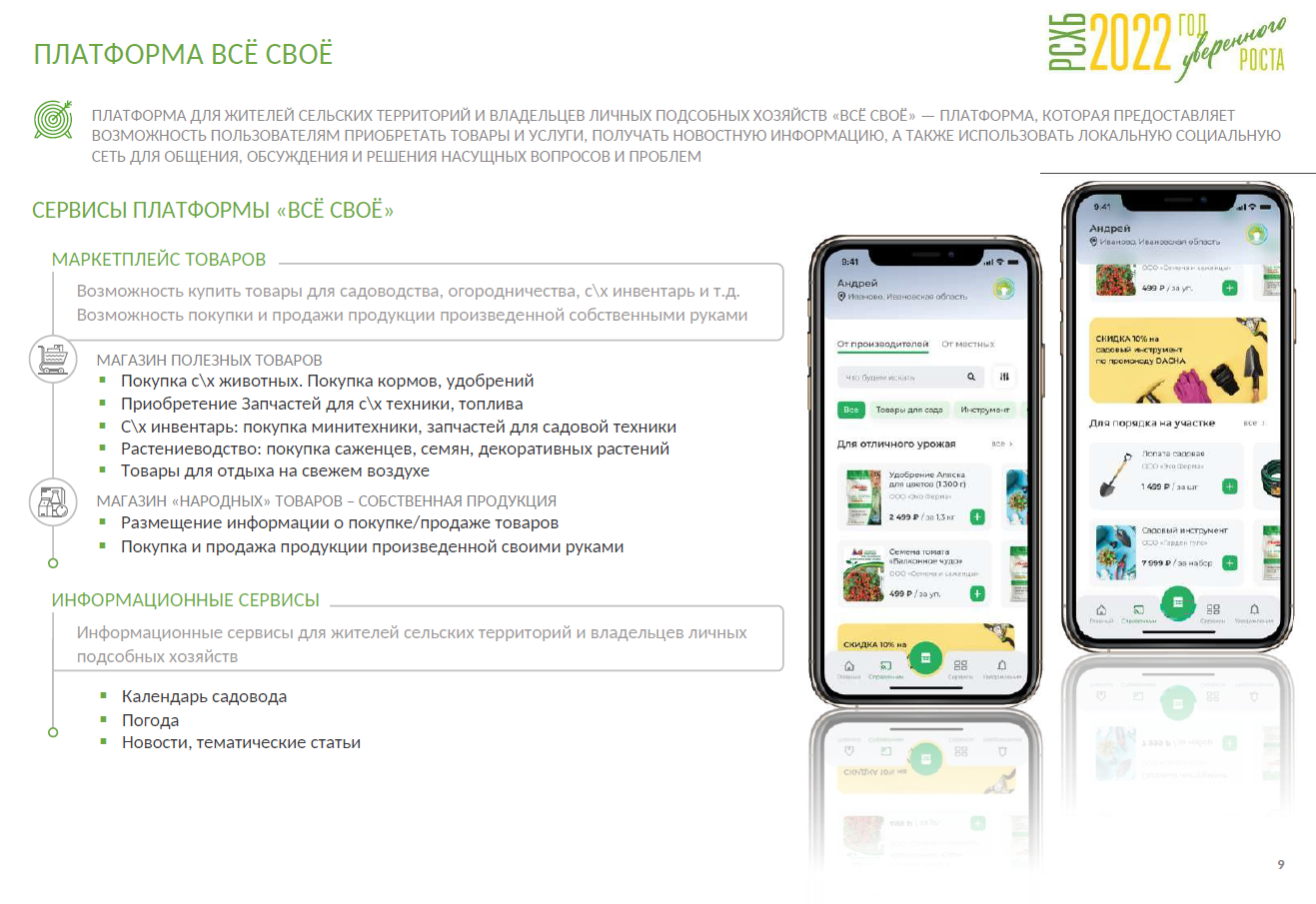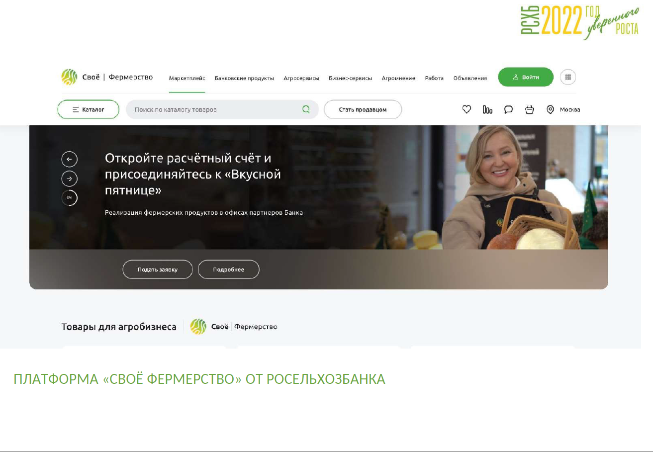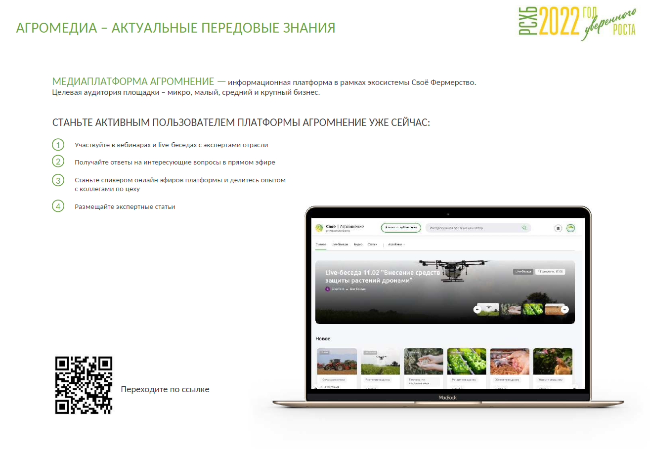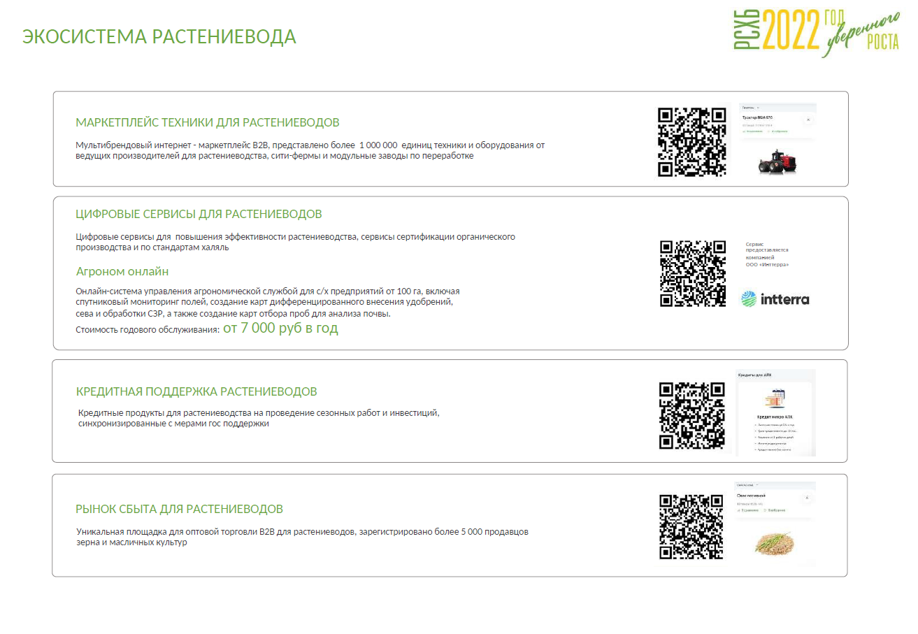 Россельхозбанк разрабатывает целую экосистему цифровых решений для сельхозбизнеса. Она объединяет несколько платформ, на базе которых можно пройти обучающие курсы и стажировки, найти работу в сфере агропромышленного комплекса, подобрать ипотечную программу, чтобы выгодно приобрести жилье в сельской местности, продать и купить фермерскую продукцию на маркетплейсах, забронировать агротуры и многое другое.