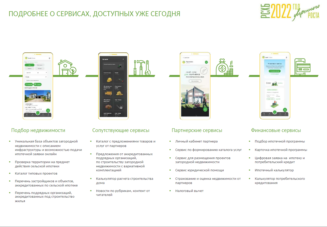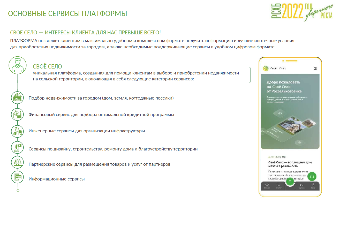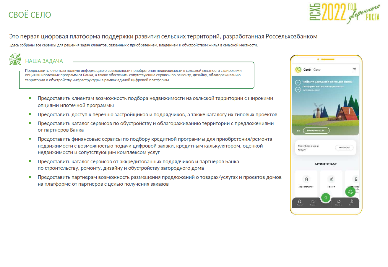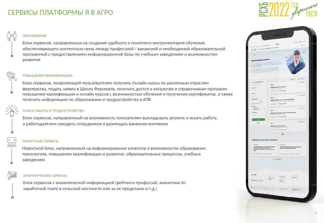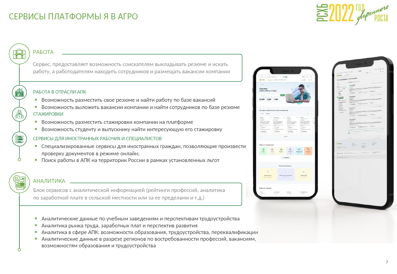 Россельхозбанк разрабатывает целую экосистему цифровых решений для сельхозбизнеса. Она объединяет несколько платформ, на базе которых можно пройти обучающие курсы и стажировки, найти работу в сфере агропромышленного комплекса, подобрать ипотечную программу, чтобы выгодно приобрести жилье в сельской местности, продать и купить фермерскую продукцию на маркетплейсах, забронировать агротуры и многое другое.