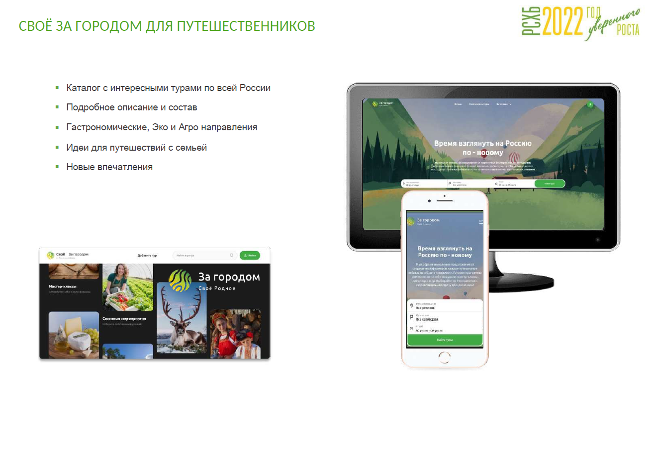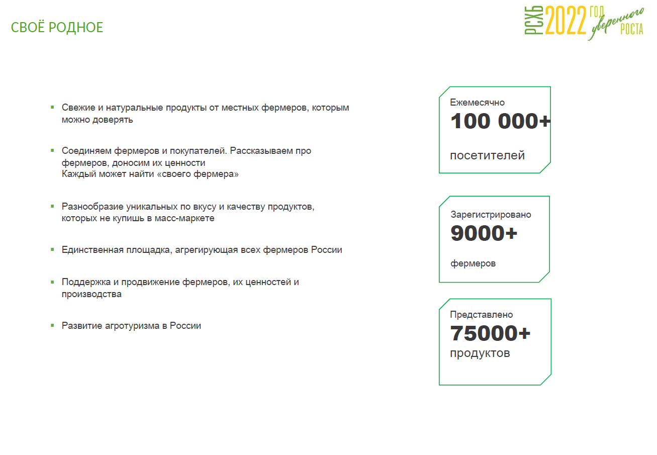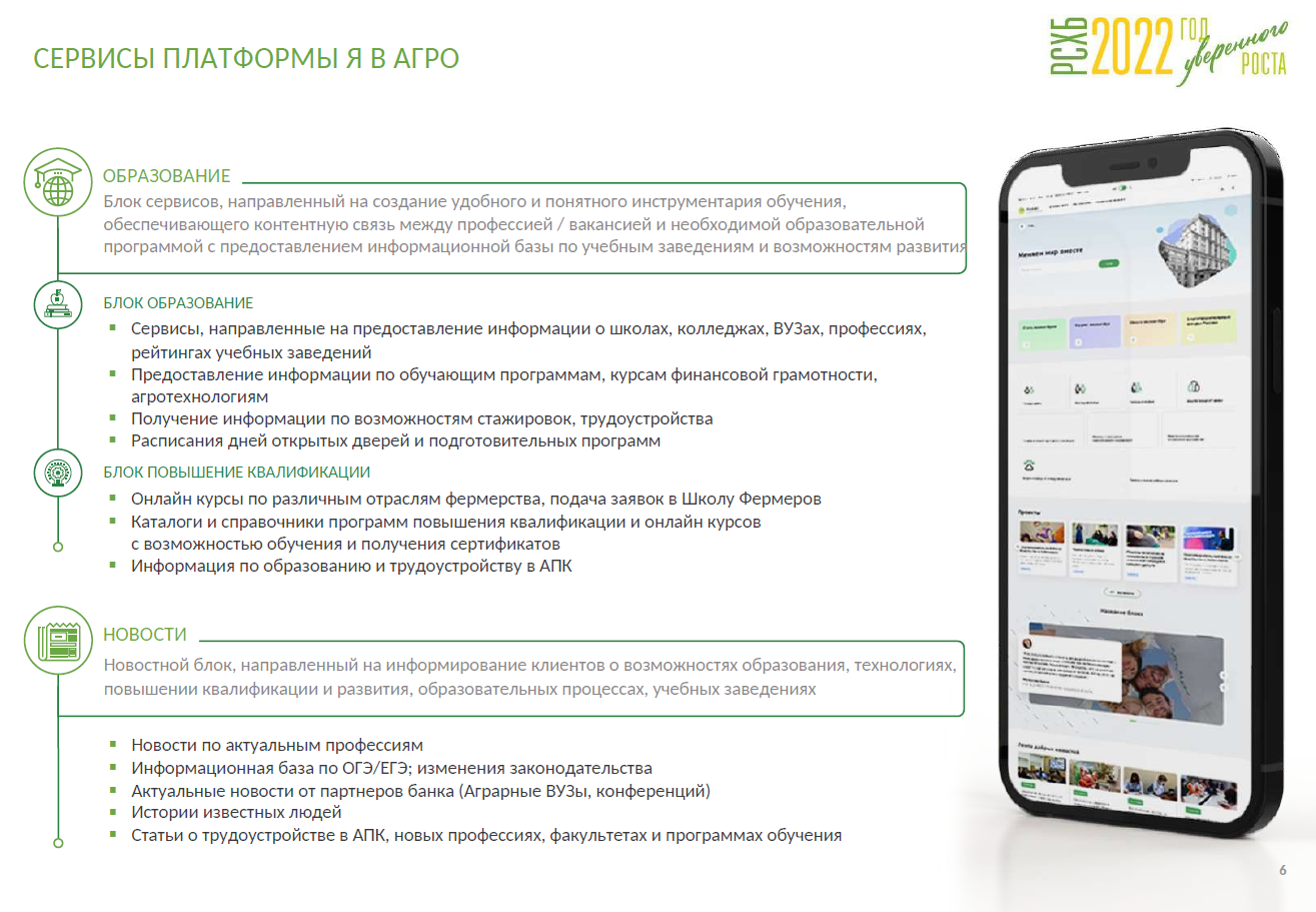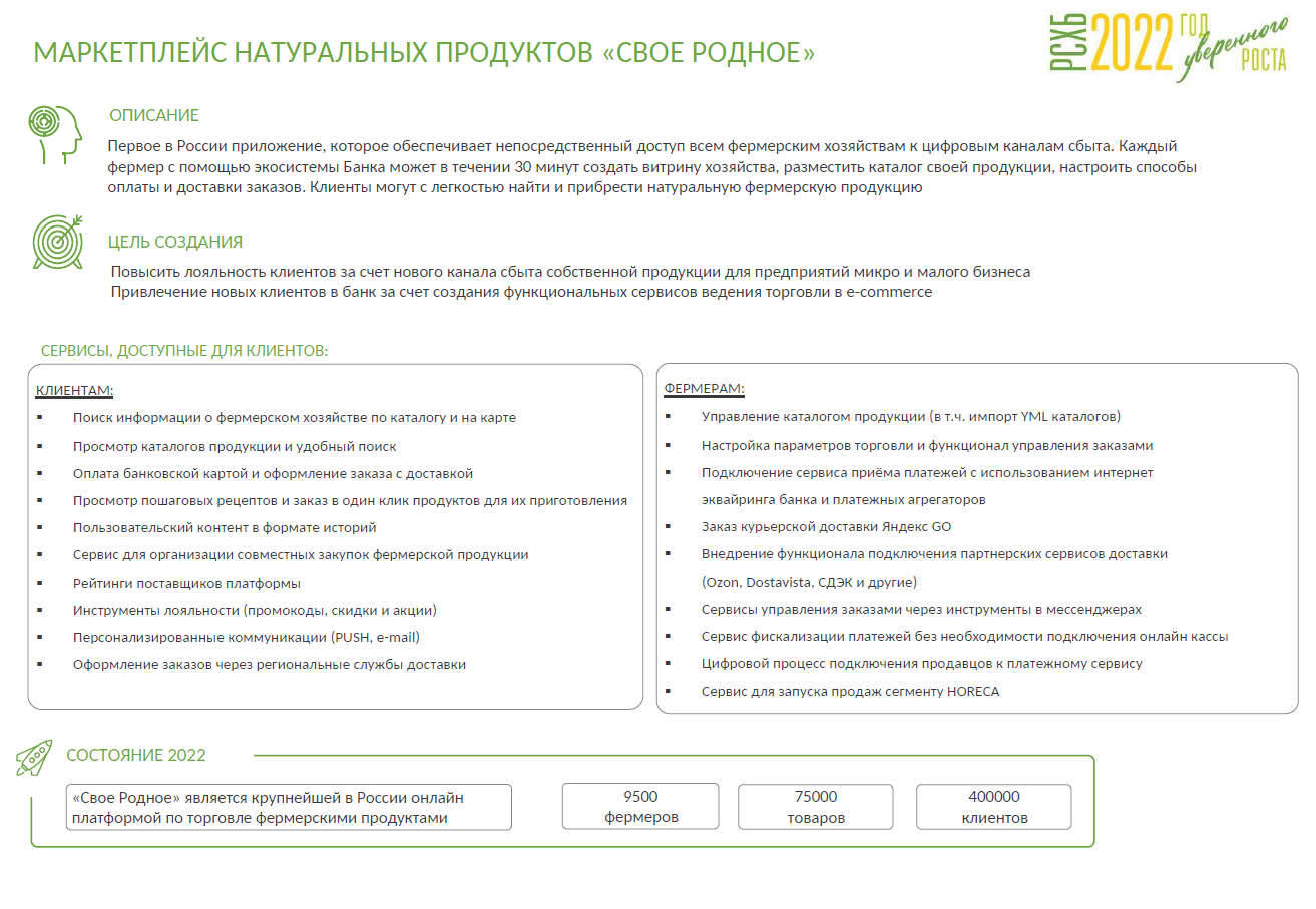 Россельхозбанк разрабатывает целую экосистему цифровых решений для сельхозбизнеса. Она объединяет несколько платформ, на базе которых можно пройти обучающие курсы и стажировки, найти работу в сфере агропромышленного комплекса, подобрать ипотечную программу, чтобы выгодно приобрести жилье в сельской местности, продать и купить фермерскую продукцию на маркетплейсах, забронировать агротуры и многое другое.