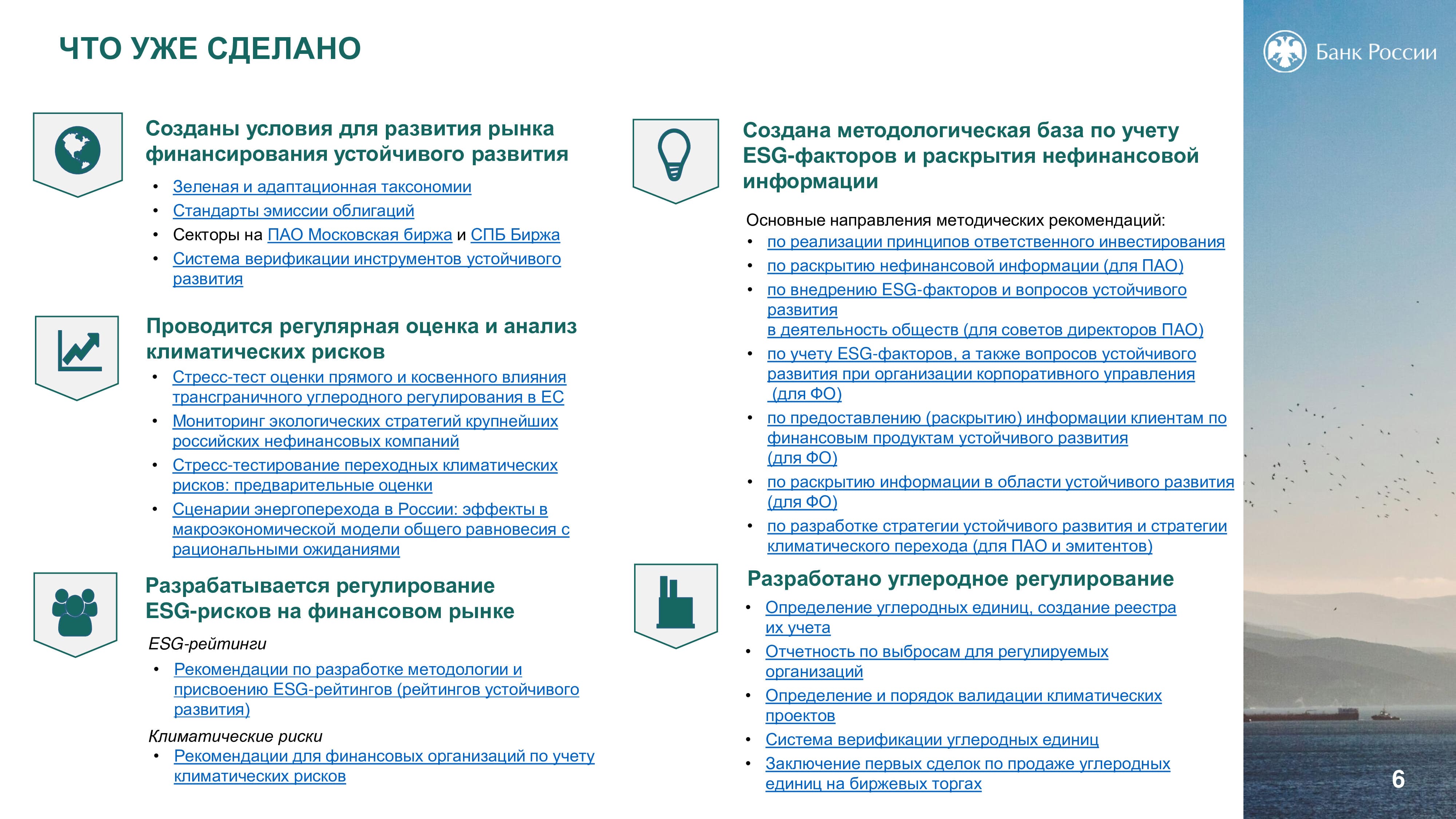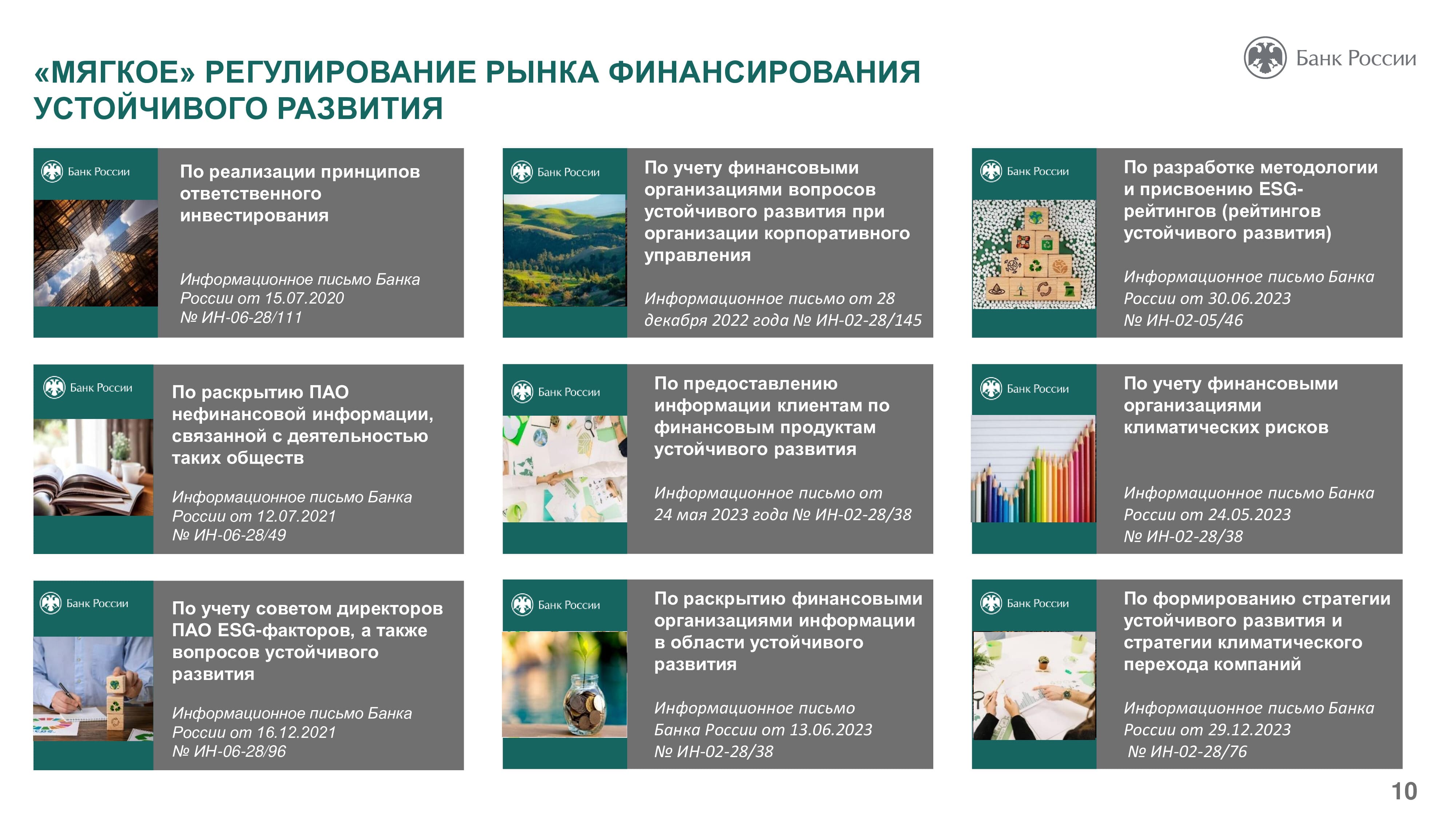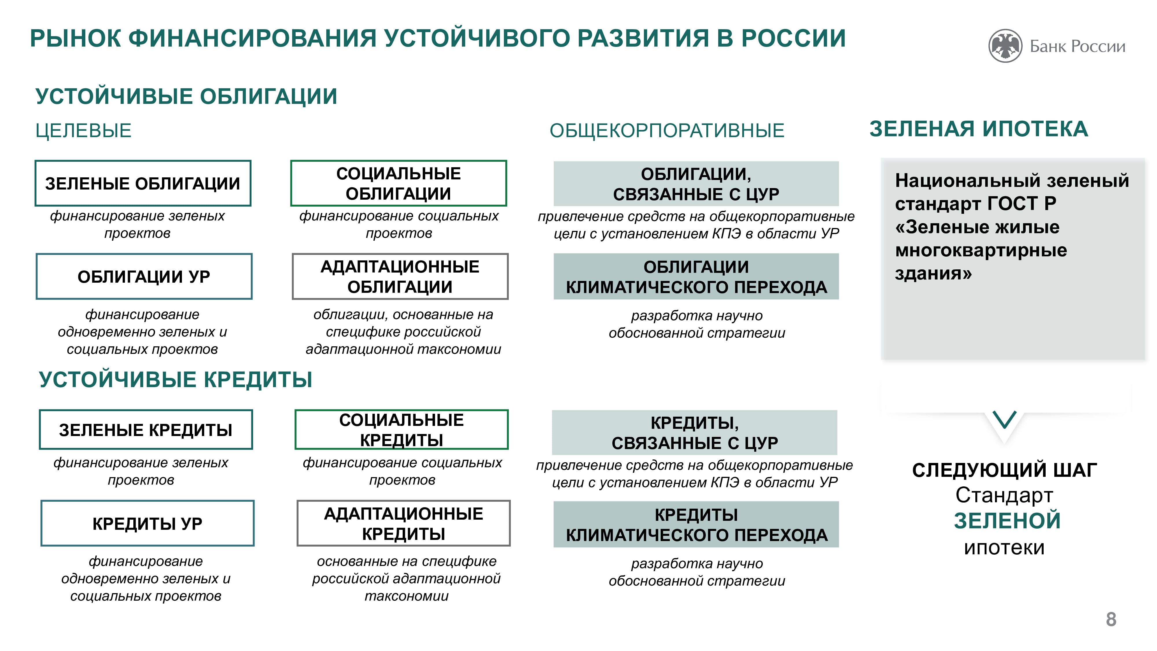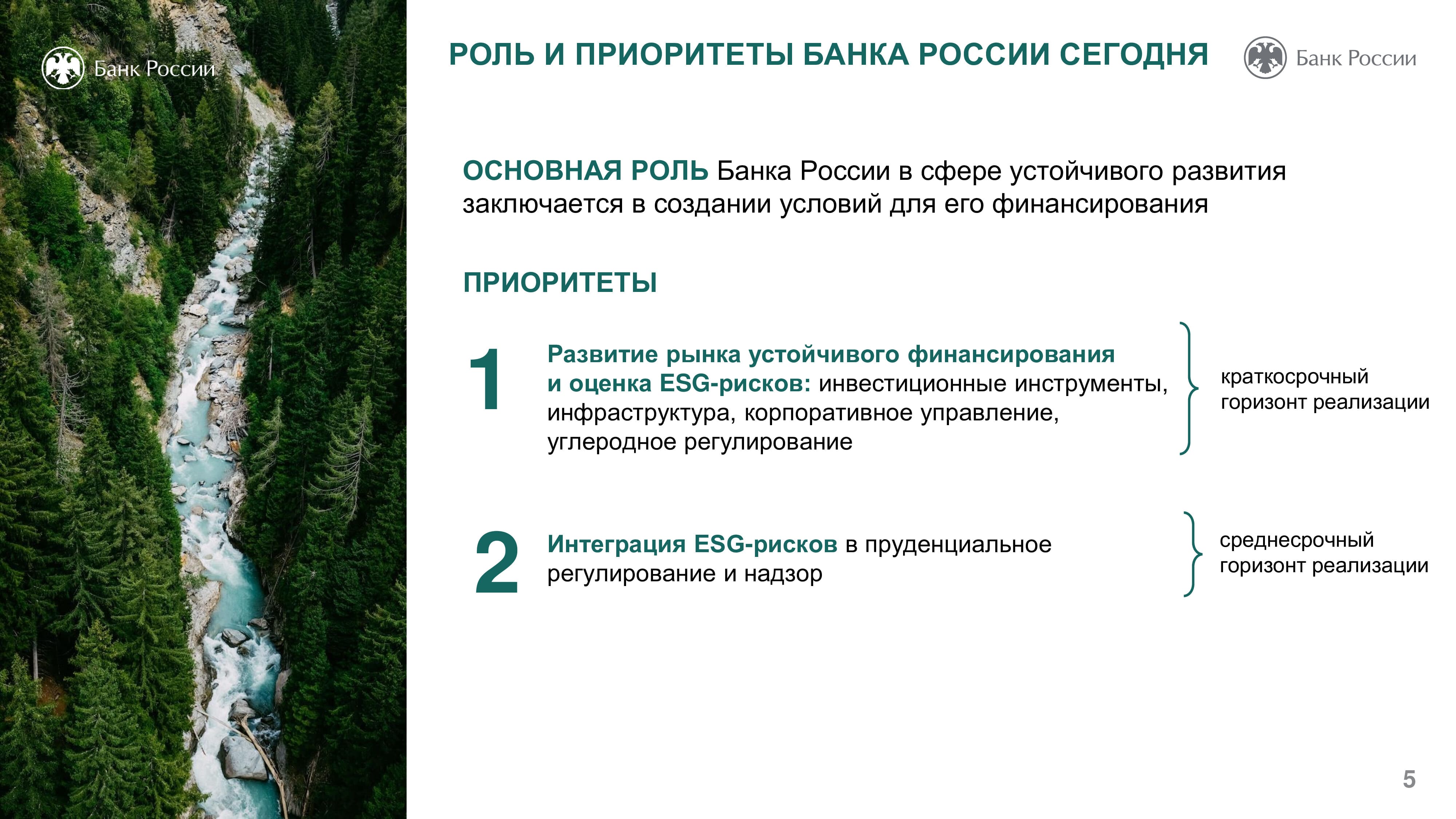 Основная роль Банка России в сфере устойчивого развития заключается в создании условий для его финансирования. Так, в 2020 году возникли новые стандарты эмиссии ценных бумаг, в которых появились социальные и зеленые облигации. Центробанк работает также над вопросом оценки целей устойчивого развития. ЦБ РФ помогает компаниям учитывать риски, возникающие при переходе к устойчивому развитию. Разработанные регулятором рекомендации позволят участникам рынка систематизировать информацию о своем воздействии на окружающую среду, социальной ответственности ведения бизнеса, что даст возможность инвесторам судить об их долгосрочной финансовой стабильности. Оценка ESG-рисков позволяет оценить стратегии компании и как долго они смогут работать и, таким образом, оценить перспективы инвестирования.
