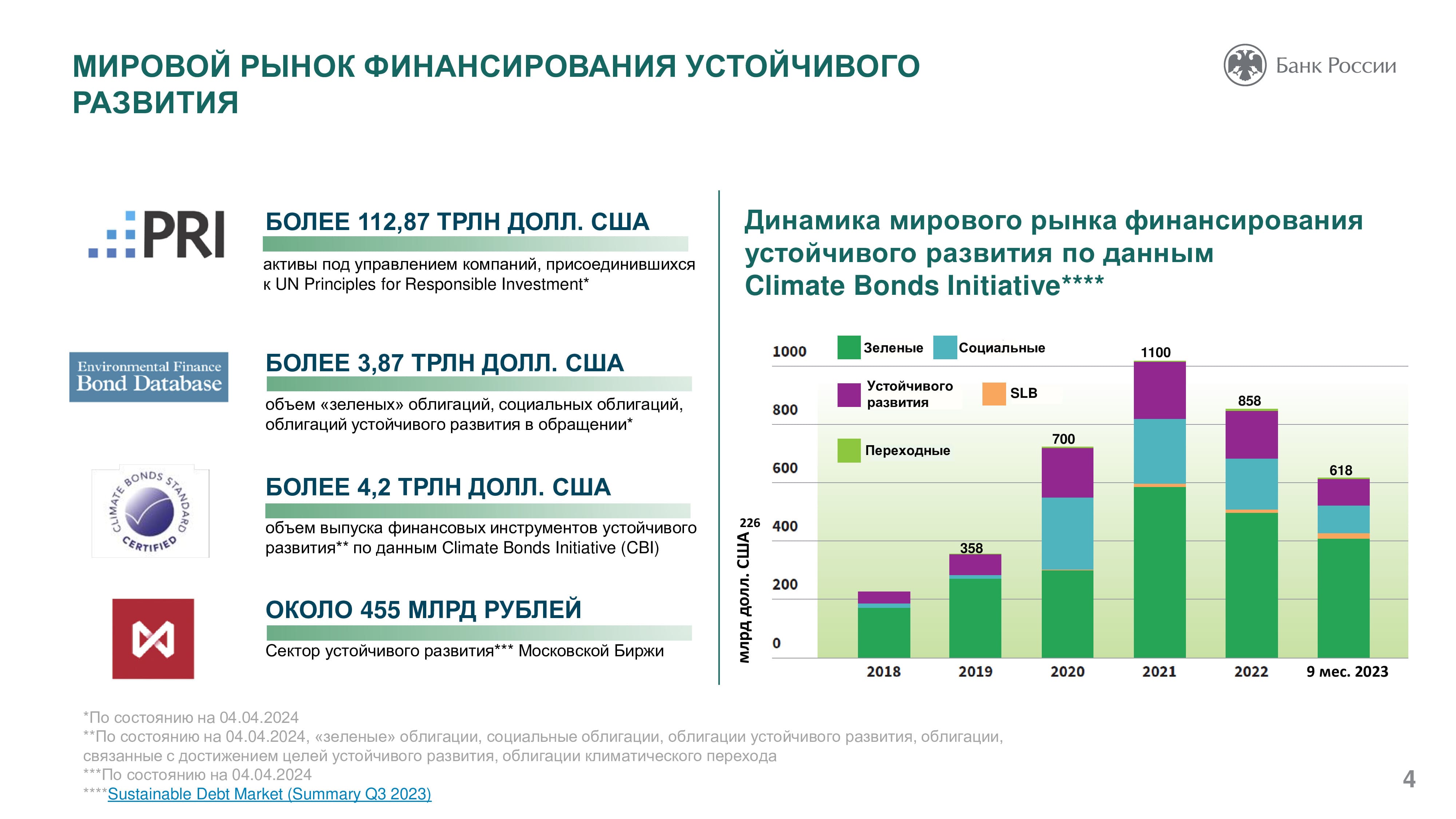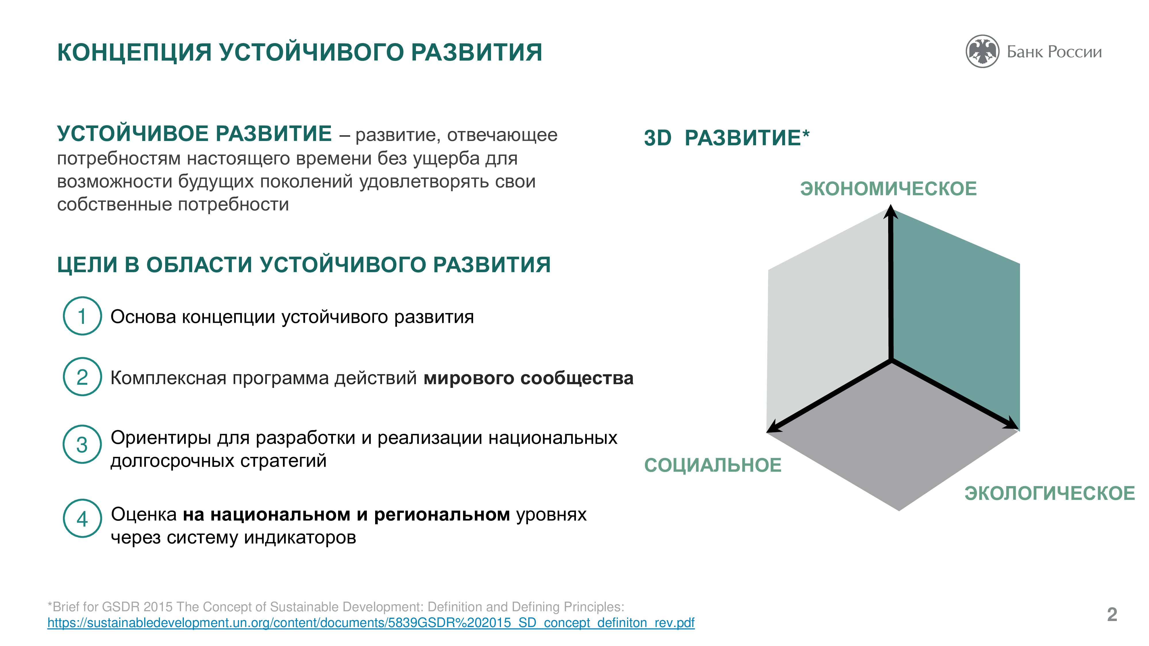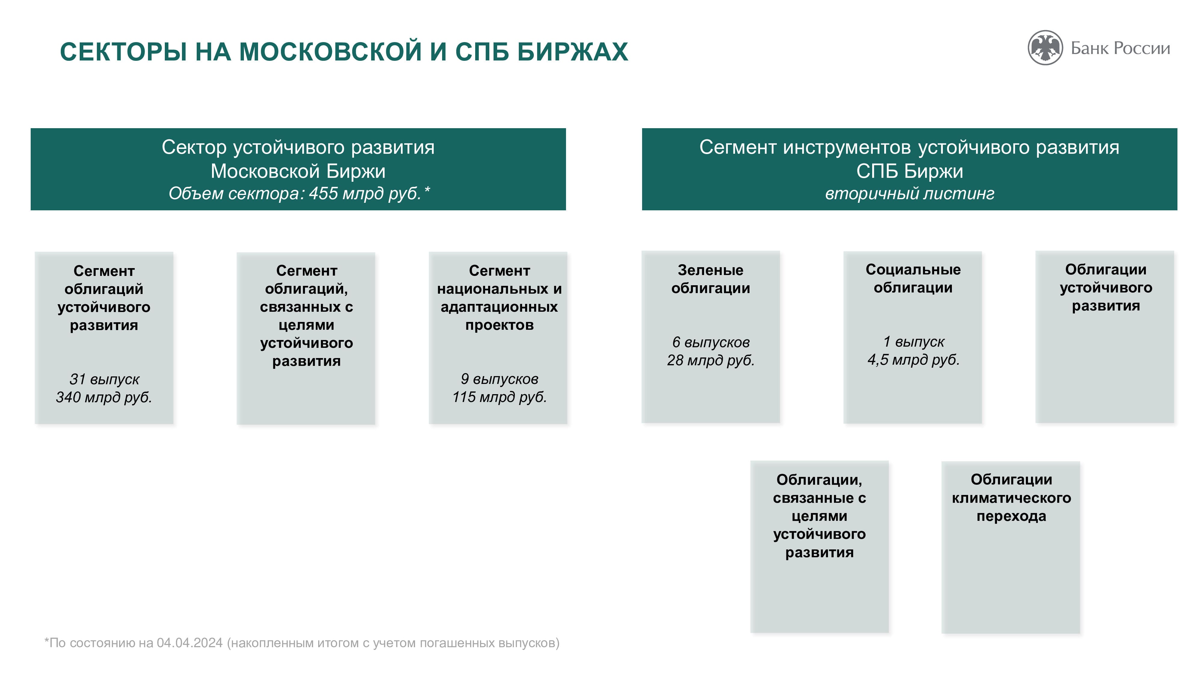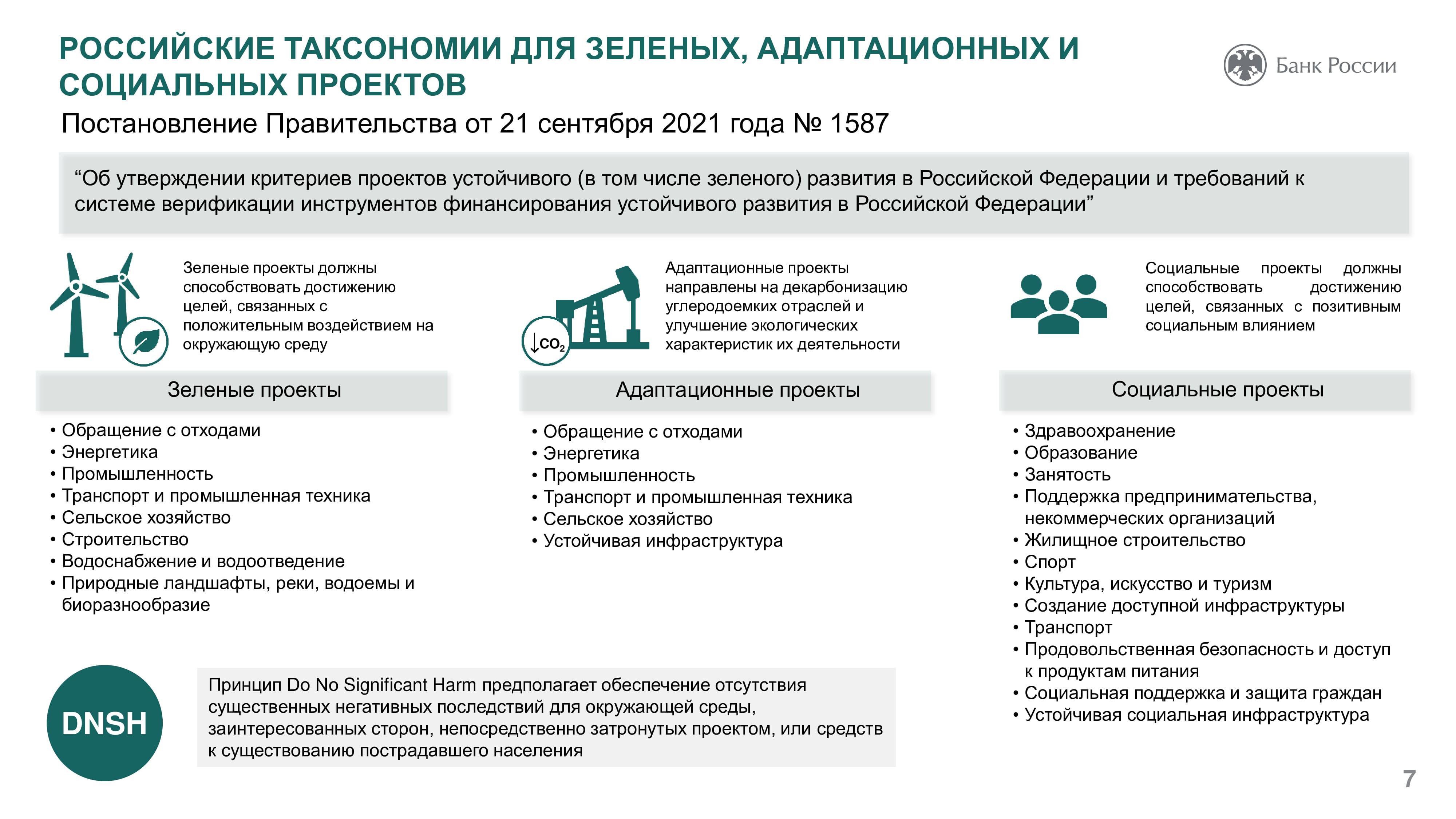 Основная роль Банка России в сфере устойчивого развития заключается в создании условий для его финансирования. Так, в 2020 году возникли новые стандарты эмиссии ценных бумаг, в которых появились социальные и зеленые облигации. Центробанк работает также над вопросом оценки целей устойчивого развития. ЦБ РФ помогает компаниям учитывать риски, возникающие при переходе к устойчивому развитию. Разработанные регулятором рекомендации позволят участникам рынка систематизировать информацию о своем воздействии на окружающую среду, социальной ответственности ведения бизнеса, что даст возможность инвесторам судить об их долгосрочной финансовой стабильности. Оценка ESG-рисков позволяет оценить стратегии компании и как долго они смогут работать и, таким образом, оценить перспективы инвестирования.