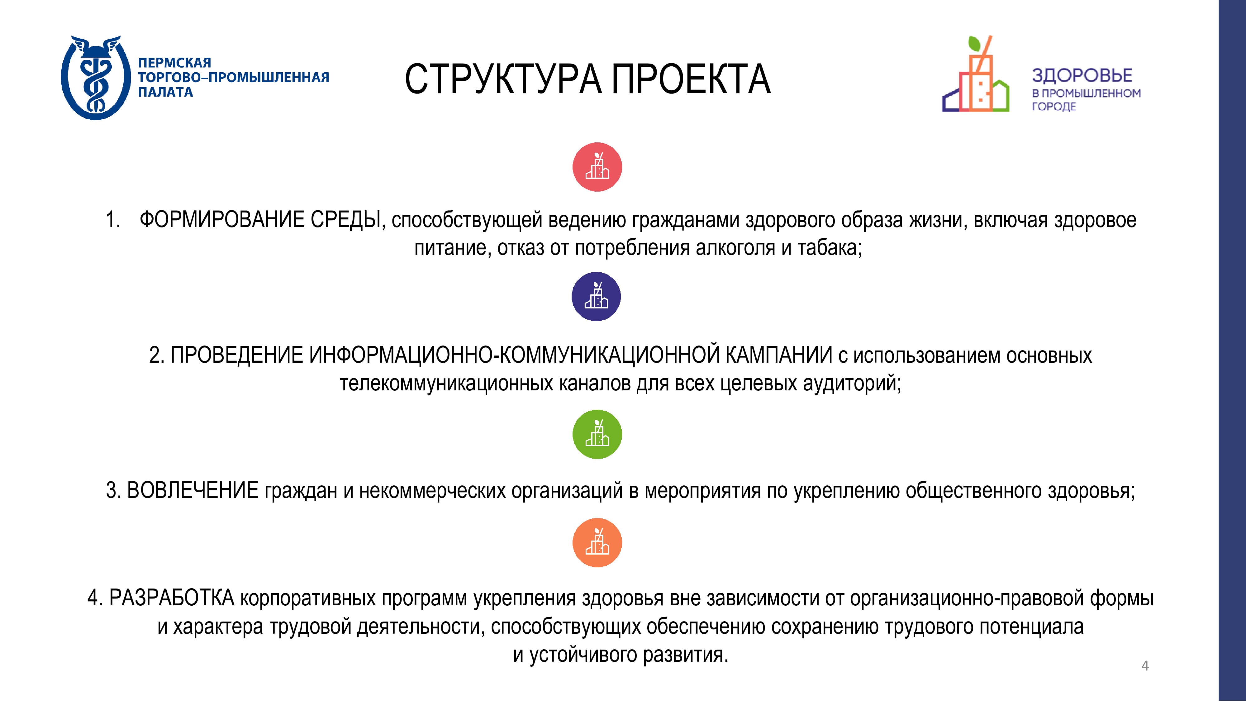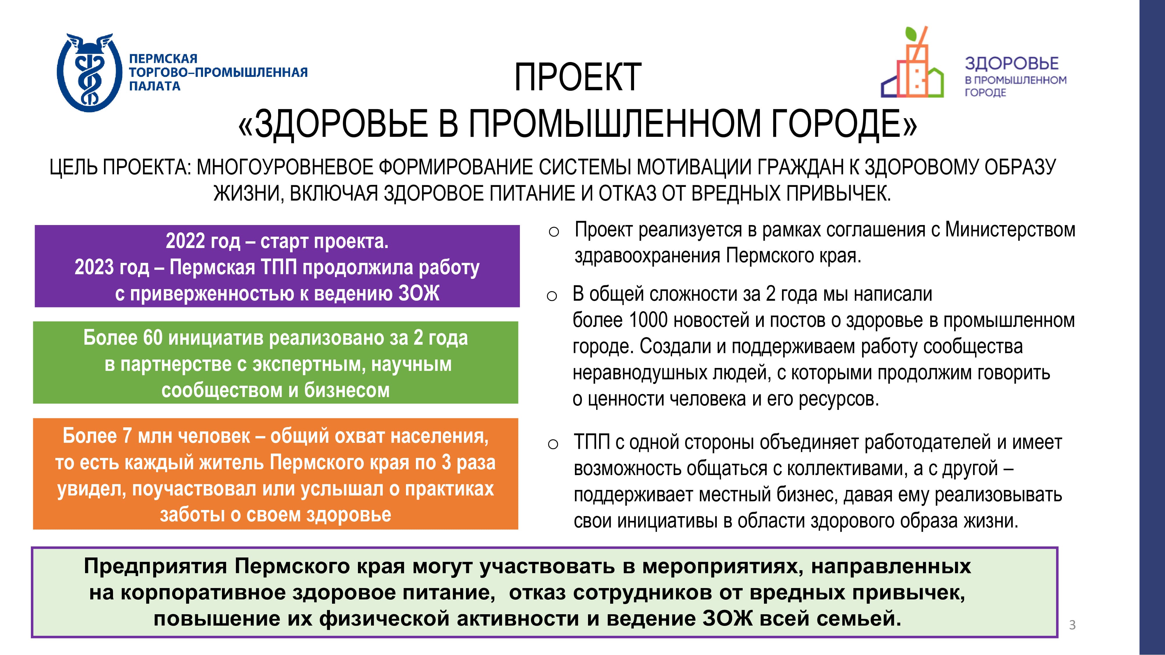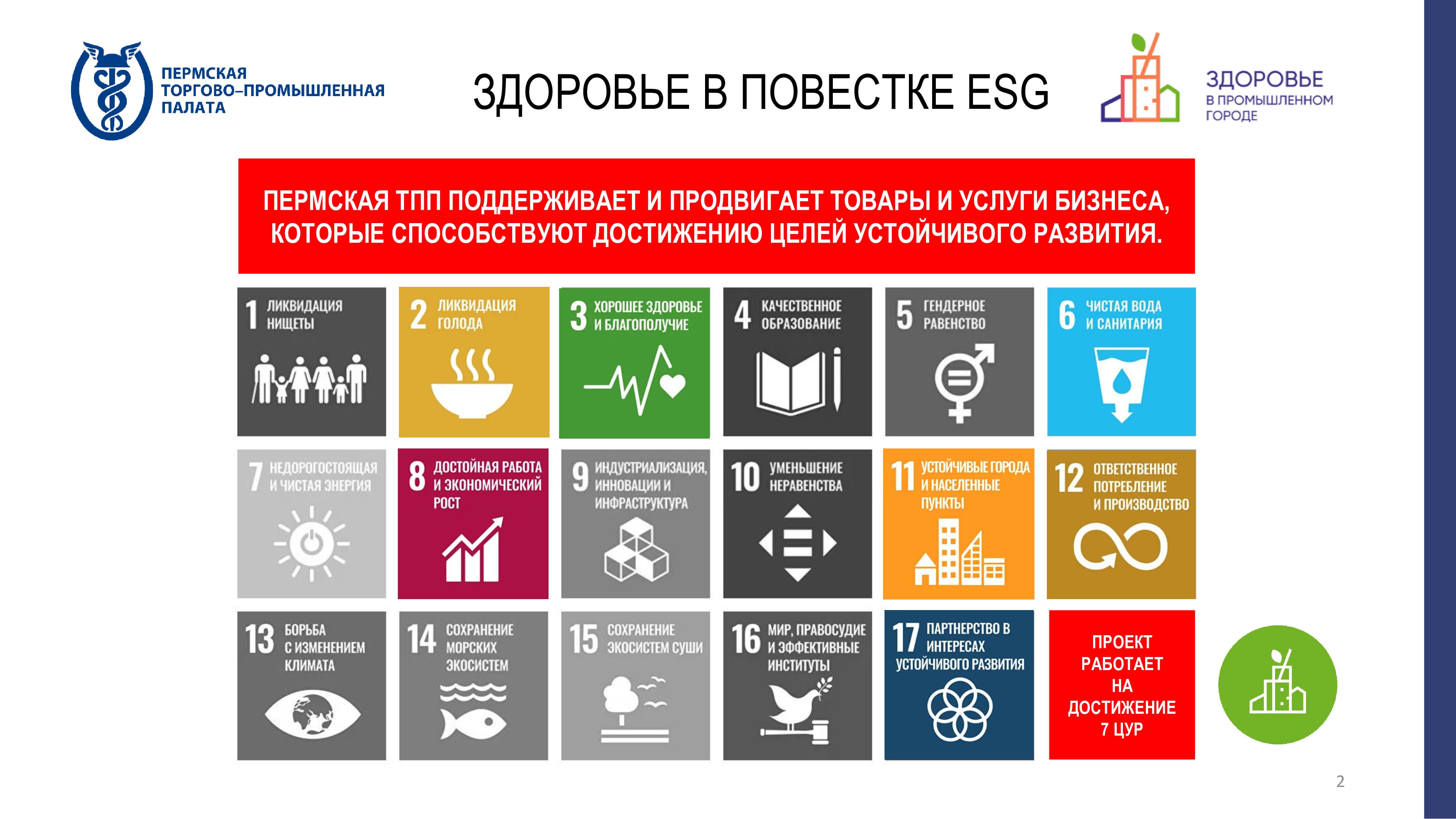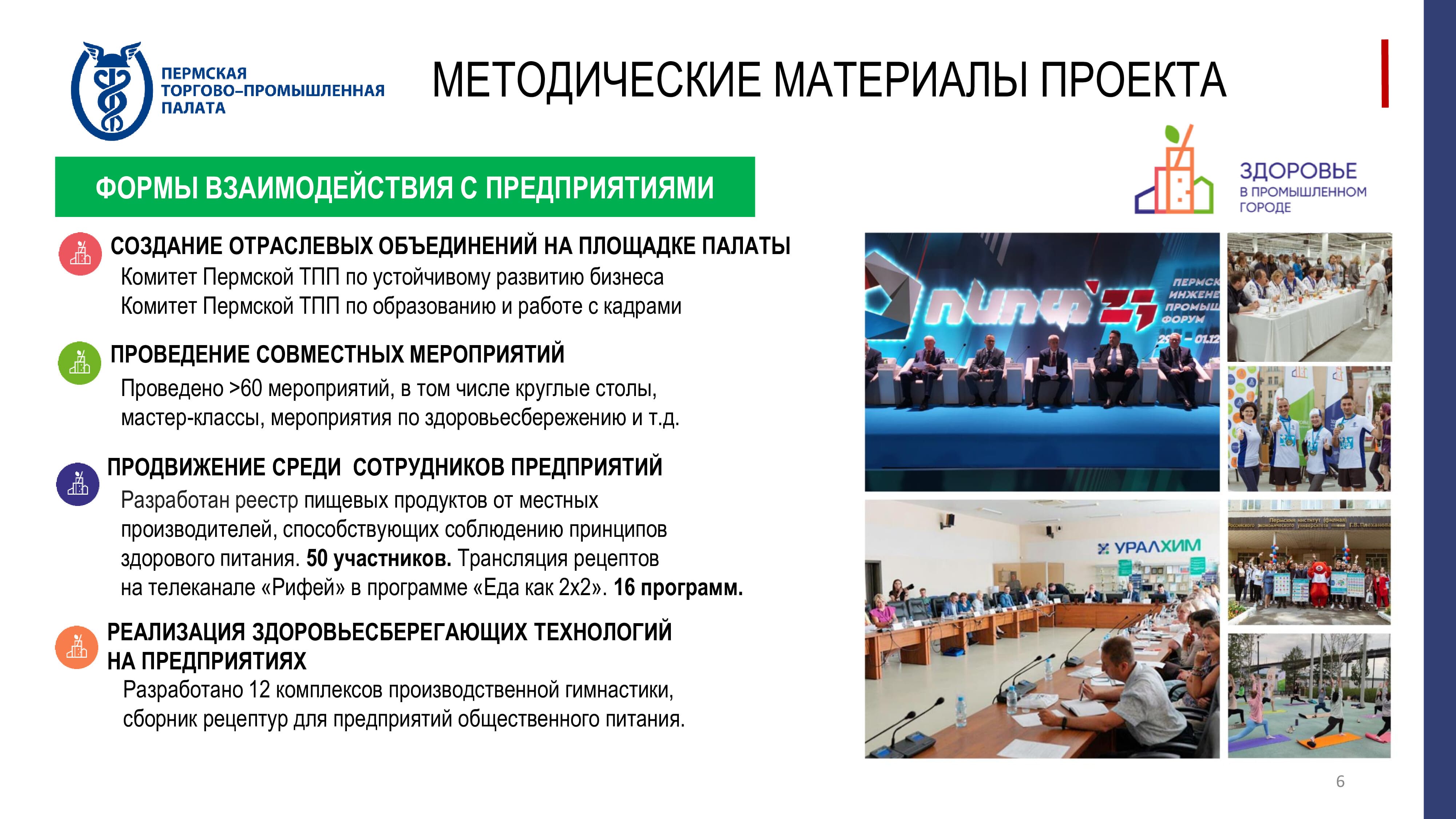 Эксперты отмечают, что в вопросе устойчивого развития особое внимание уделяется социальному фактору. Президент Пермской ТПП Вячеслав Белов рассказал о проекте ТПП «Здоровье в промышленном городе», который направлен на разработку корпоративных программ укрепления здоровья, способствующих обеспечению сохранения трудового потенциала и устойчивого развития. Задача ТПП – отработка набранных практик и их тиражирование. Предприятия Пермского края могут участвовать в мероприятиях, направленных на корпоративное здоровое питание, отказ сотрудников от вредных привычек, повышение их физической активности и ведение ЗОЖ всей семьей. «То, что мы делаем, охватывает практически все население Пермского края», – считает президент Пермской ТПП. Для этого проводятся массовые мероприятия, налаживается взаимодействие с крупными промышленными предприятиями региона. ТПП предлагает использовать различные механизмы внедрения здорового образа жизни. Например, разработан комплекс производственной гимнастики и созданы рекомендации по формированию здорового меню в столовых предприятий. Вячеслав Белов отметил, что все эти мероприятия имеют отложенные эффекты, но они важны в условиях дефицита кадров.