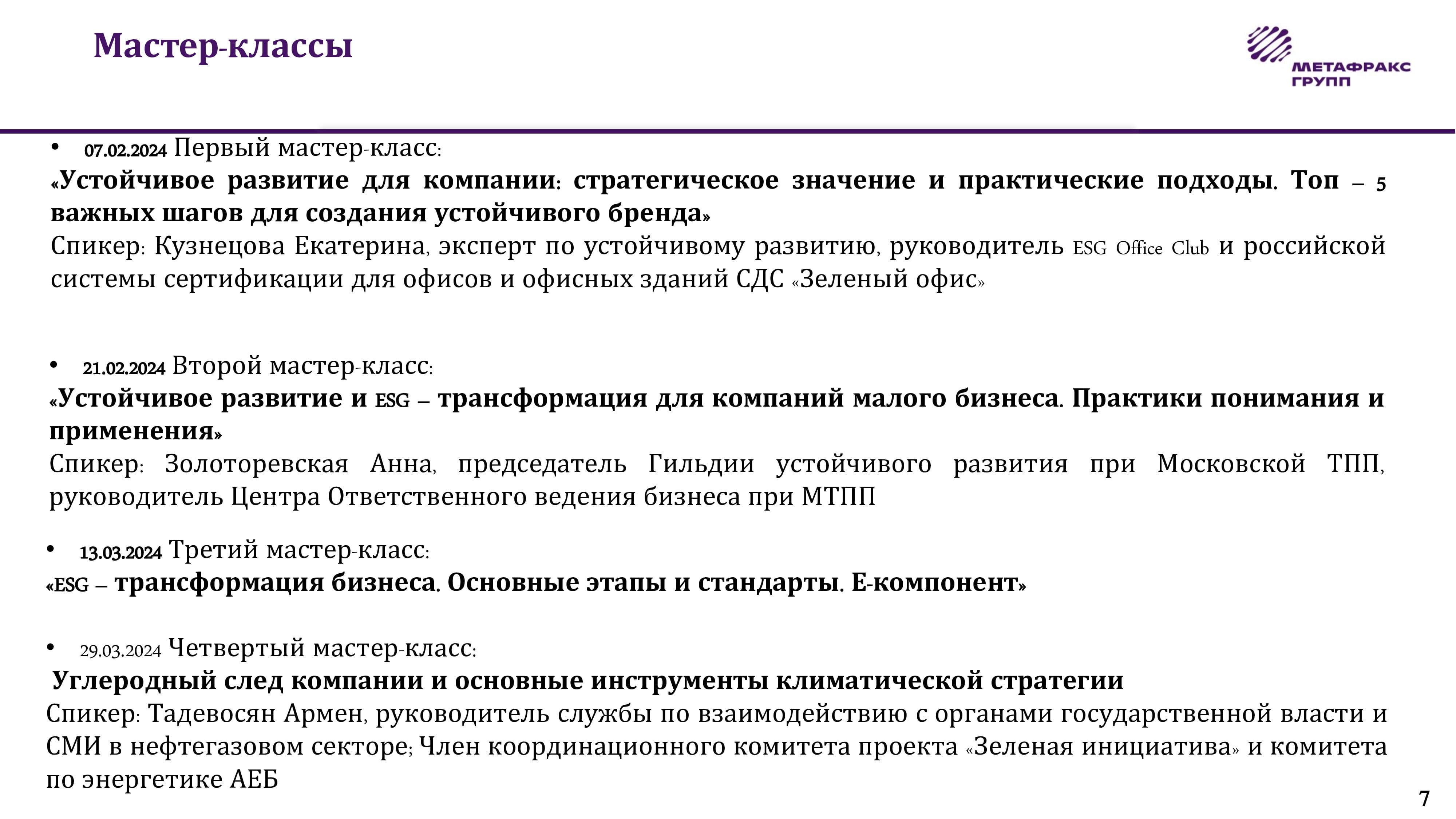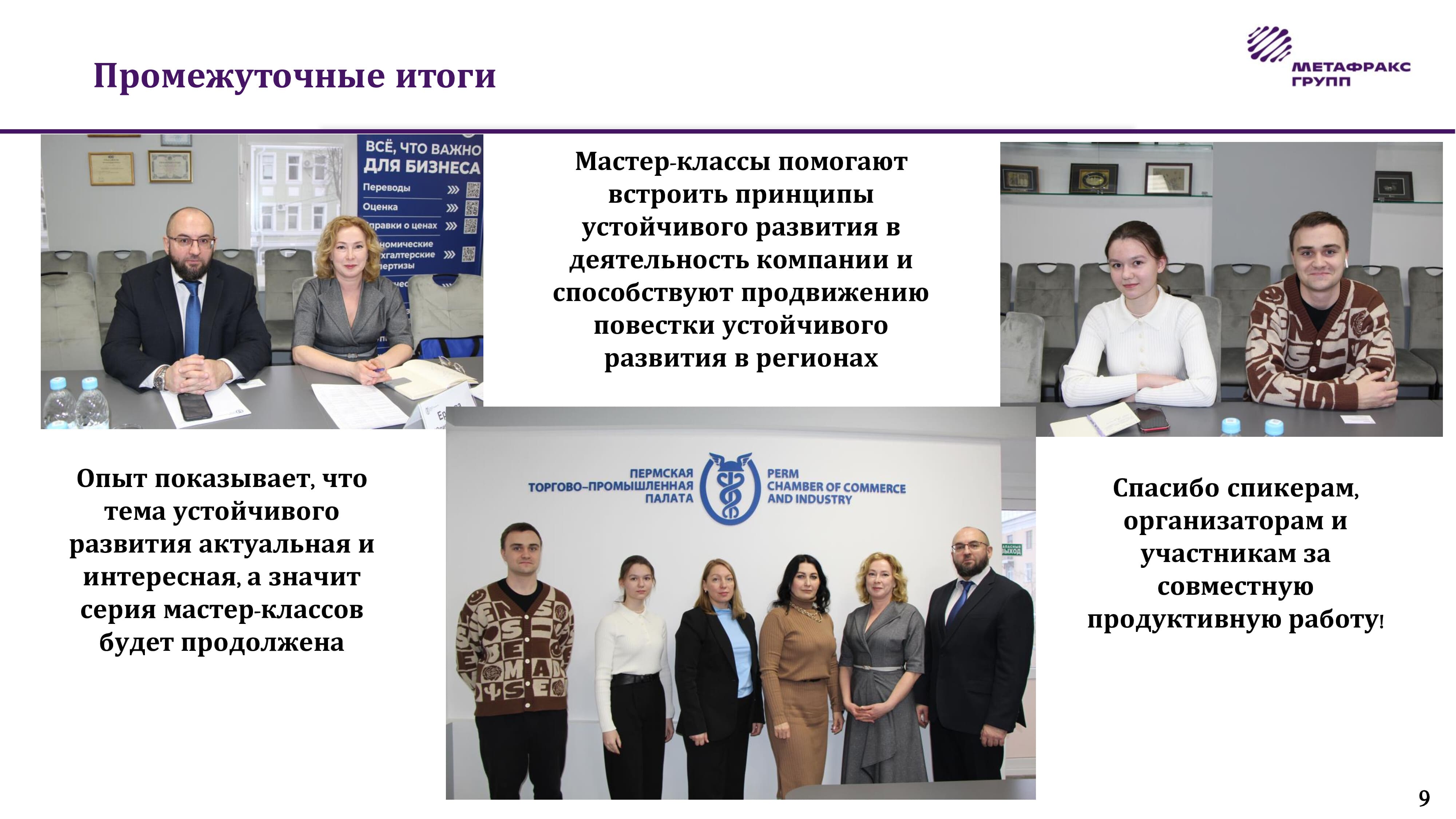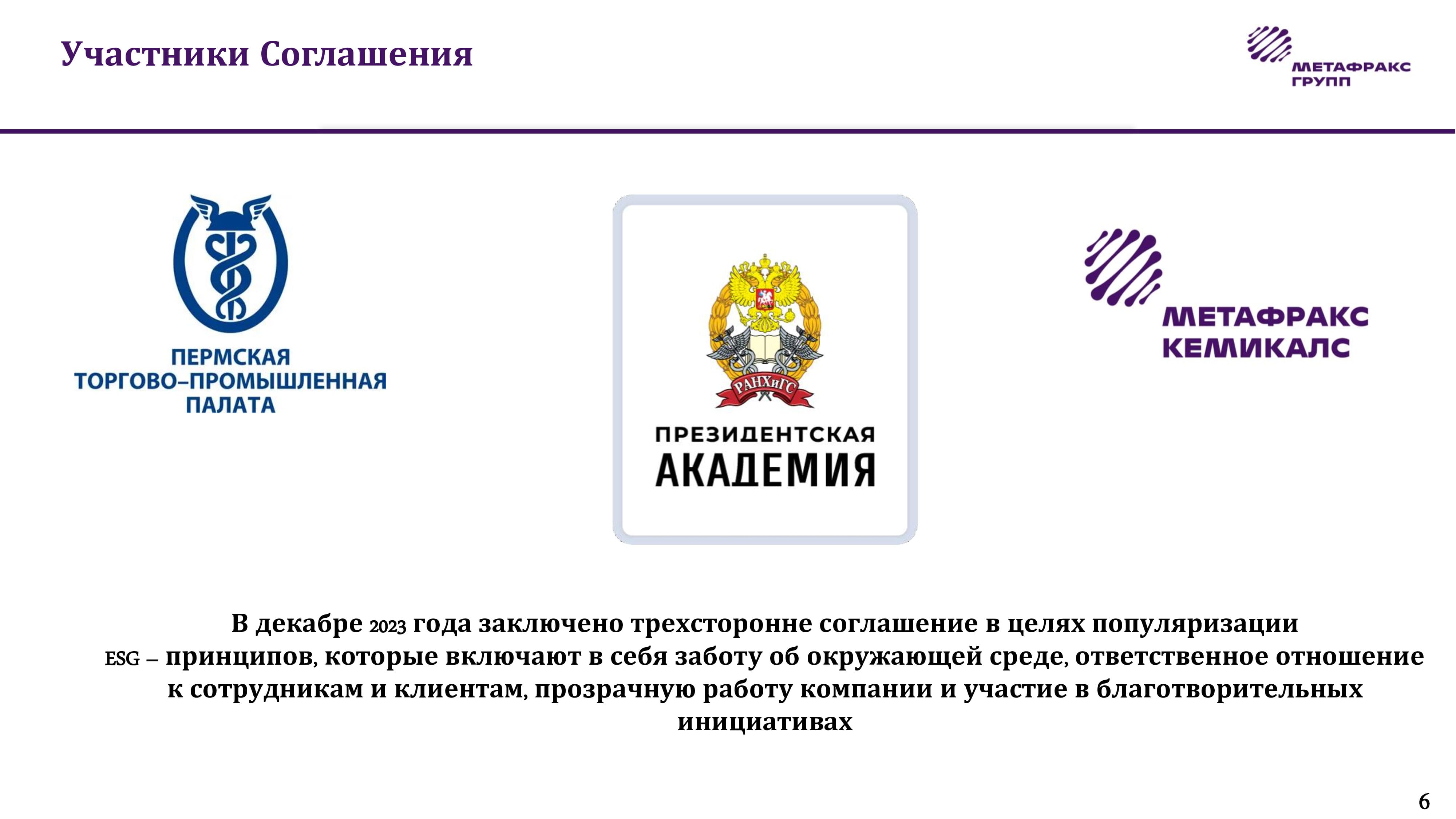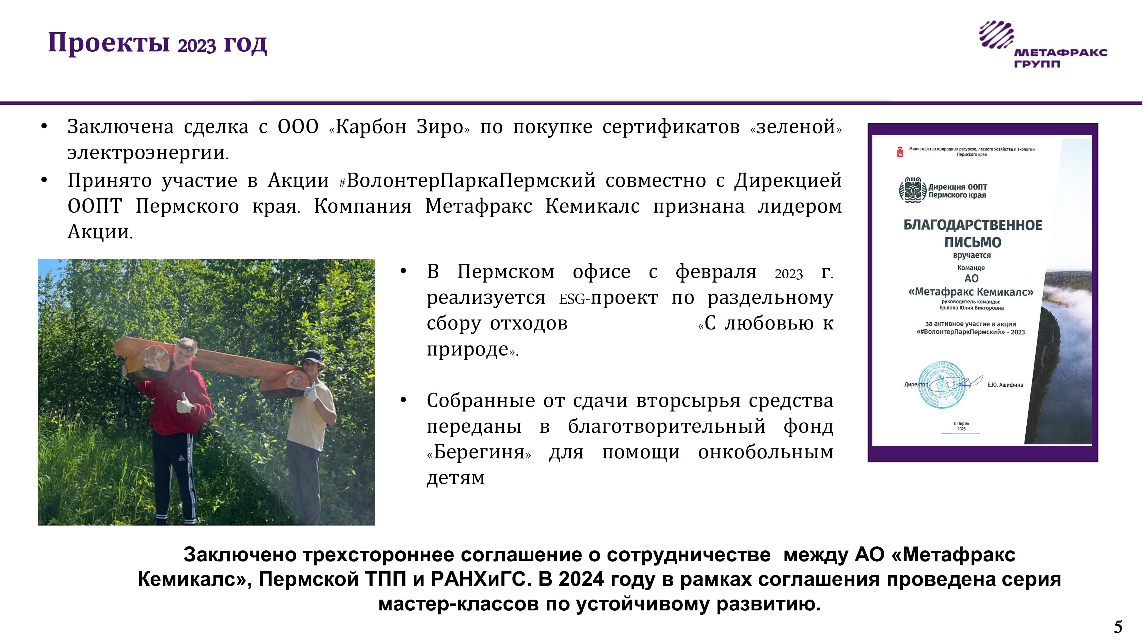 Юлия Ершова, ведущий эксперт по вопросам устойчивого развития АО «Метафракс Кемикалс», рассказала об опыте компании по внедрению принципов устойчивого развития. В компании в декабре 2021 года создана рабочая группа по устойчивому развитию. Дорожная карта по устойчивому развитию предприятия учитывает все пять национальных целей развития России: здоровье и благополучие людей; возможность для самореализации и развития талантов; комфортная и безопасная среда для жизни; достойный, эффективный труд и успешное предпринимательство; цифровая трансформация. «Сейчас важно не только зарабатывать, но и как зарабатывать, поскольку у многих компаний недостаток квалифицированного персонала. Для молодых работников важно знать, что компания не несет вреда окружающей среде, соблюдает законодательство», – отметила Юлия Ершова. По ее словам, согласно статистическим данным – из трех направлений ESG 75% российских компаний уделяют внимание именно социальным аспектам устойчивого развития. Например, АО «Метафракс Кемикалс» активно участвует в благотворительных проектах: в 2021–2023 годах расходы компании на благотворительность составили 131,6 млн рублей.