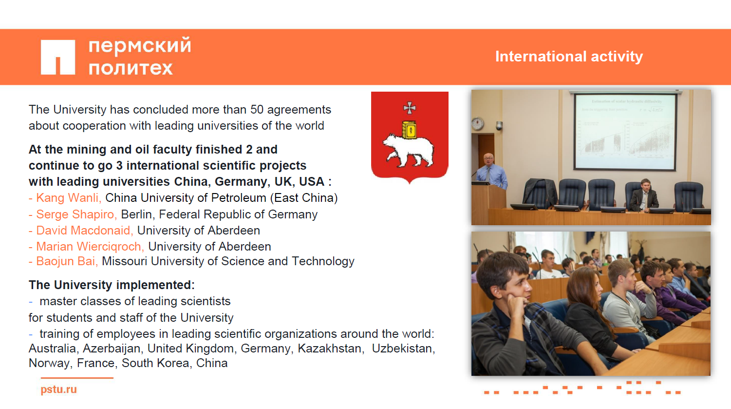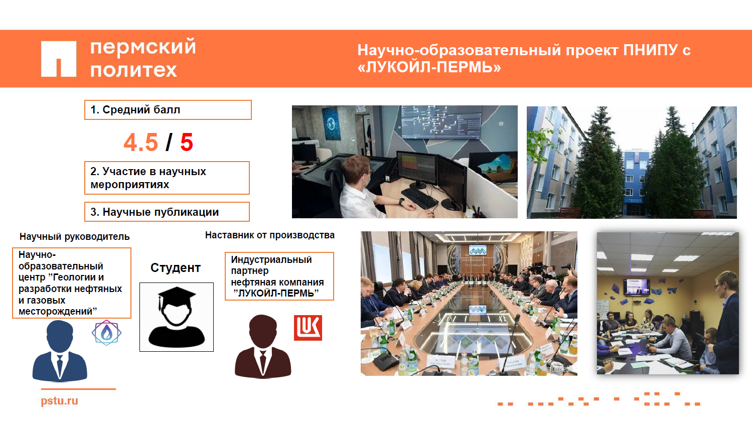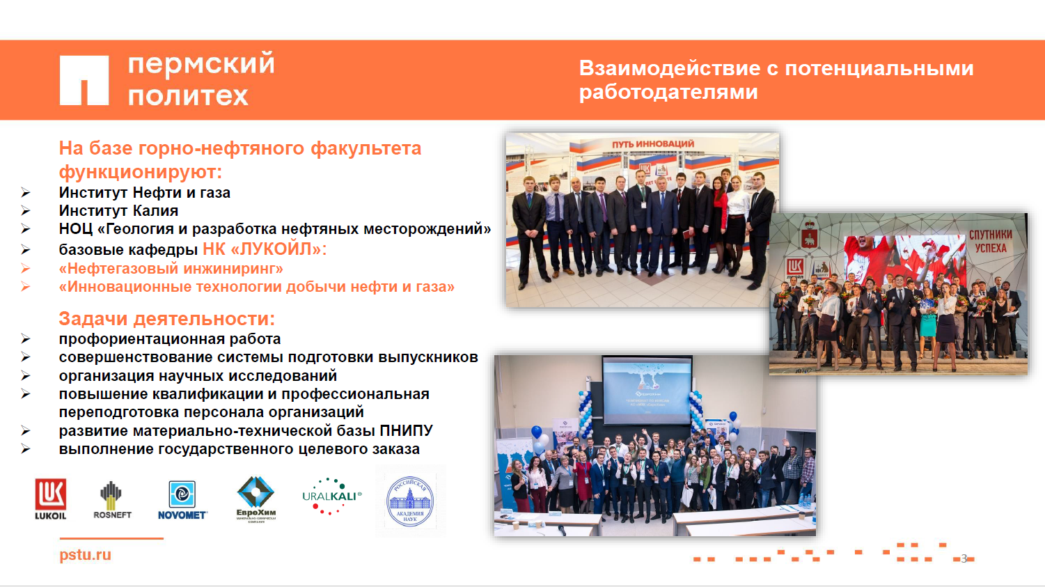Декан горно-нефтяного факультета Пермского национального исследовательского политехнического университета Сергей Галкин заверил, что вуз может решить проблемы с инженерными кадрами, которая существует у промышленников. «Для этого есть система целевого заказа, которой уже пользуются многие предприятия, – пояснил он. – Преимущество нашего университета в том, что мы тесно сотрудничаем с индустриальными партнерами, например с ГК «ЛУКОЙЛ». Уже со старших курсов наши студенты начинают работать над решением конкретных производственных задач. В итоге на предприятия они приходят уже готовыми специалистами».